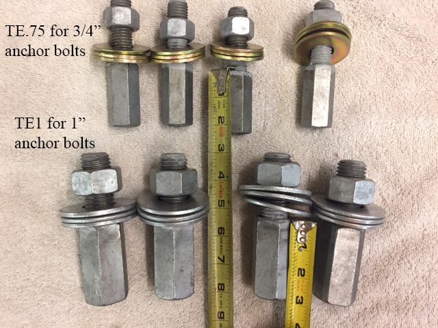 The TE.75 and TE1 are most commonly used when the existing anchor bolts are rusted or damaged above the concrete footing. Chip out concrete to expose useable threads, cut off excess anchor bolt, and install the Thread Extender. The next common use is when anchor bolt projection is too short.
